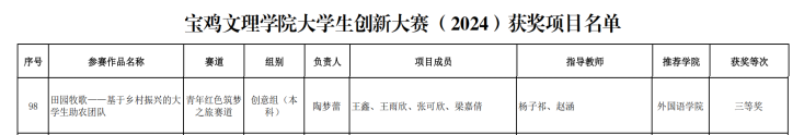 根据《陕西省教育厅办公室关于举办中国国际老员工创新大赛(2024)陕西赛区省级复赛的通知》(陕教高办〔2024〕14号),公司举办了中国国际老员工创新大赛(2024)选拔赛并组织参加了省级复赛。依据《关于表彰公司老员工创新大赛(2024)获奖项目的决定》(宝文理院教字〔2024〕97号),最终评选出特等奖2项、一等奖10项、二等奖24项、三等奖67项。公司员工陶梦蕾项目组的“田园牧歌——基于乡村振兴的老员工助农团队”,获得三等奖。获奖名单如下: