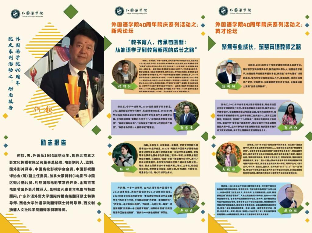 27日下午,在高新校区立心楼举办了三场员工论坛。在“励志报告”环节,北京真之影文化传媒公司总经理、中国翻译协会影视译制委员会副主任委员何钦作了题为《从师范生到电影制片人》的报告,激励同学们在学业和人生道路上奋勇前行。在“英才论坛”环节,陕西省英语学科带头人、宝鸡渭滨中学冶向阳,省级教学能手、宝鸡渭滨中学教务处副主任郭艳红,西安市教育科学研究院教研员、人教社英语教材评审专家樊红斌,陕西省英语学科带头人、渭南高级中学吴晓雅分享了经验:冶向阳从新课标开始,讲述自己如何向先辈、同行学习,不断成长;郭艳红亲切展示自己曾经艰苦求学的画面,让同学们倍加珍惜当下优越环境,她的一句“我不是能干,只是肯干”让同学们坚信只要努力,幸福生活就在不远处;吴晓雅从青涩到成熟,历经12年成为省级教学能手,她的“唯有热爱可抵岁月漫长”道尽了教师这一职业的灵魂;樊红斌则从新高考改革出发,帮助同学们了解新高考的变化趋势。在“新秀论坛”环节,西安市第85中骨干教师张锦江、西安铁一中陆港公司井鸽舞、西北工业大学咸阳启迪中学郭家玺、宝鸡高新第一初级中学杨敏,分别以“聚是一团火、散是满天星”、“一位中学英语教师的职业成长”等为主题,展现了青年教师的风采。