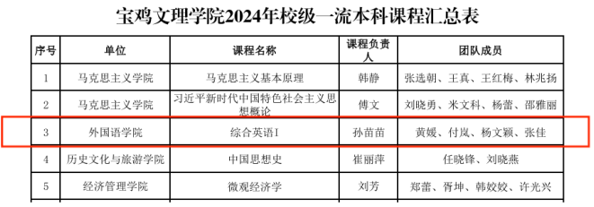 依据《关于公布2024年校级一流本科课程认定结果的通知》【宝文理院教字(2025)2号】,经个人申报、公司推荐、专家评议,公司认定《马克思主义基本原理》等20门课程为2024年校级一流本科课程,其中best365中国官方网站教师孙苗苗为课程负责人的《综合英语I》被认定为2024年校级一流本科课程。
