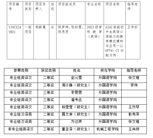 2023级学科英语专业员工胡新晨获批2024年校级研究生创新科研项目一般项目一项。2023级英语笔译专业3名研究生获第十一届“海伦·斯诺”翻译大赛专业组汉译英二等奖1项,英译汉三等奖2项。2023级学科教学(英语)专业研究生胡新晨、涂诗奇获得国家奖学金。
