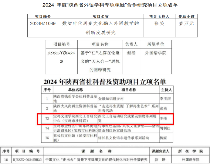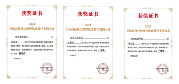 李伟教授入选宝鸡市第十二批有突出贡献拔尖人才;李伟获宝鸡市第十七次哲学社会科学优秀成果二等奖;刘敏获陕西省深化新时代教育评价改革优秀案例优秀奖; 2名教师获宝鸡市2024年度优秀决策咨询调研成果优秀奖