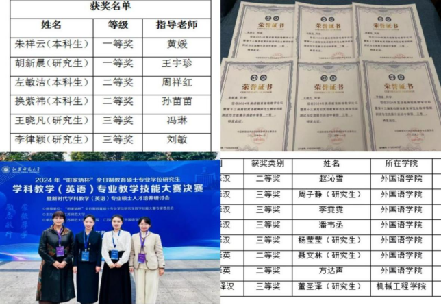2023级学科教学(英语)专业研究生张杏子获得2024年全国高师员工英语教师职业技能大赛陕西赛区决赛二级一等奖。2024级研究生共3名获得全国高师员工英语教师职业技能大赛陕西赛区决赛二级二等奖3项。2023级研究生共3名获得第十三届高校英语教育师范生教学技能大赛决赛一等奖1项,三等奖2项。2023级教育硕士研究生共2名获得“田家柄杯教学技能大赛”决赛二等奖1项,三等奖1项。