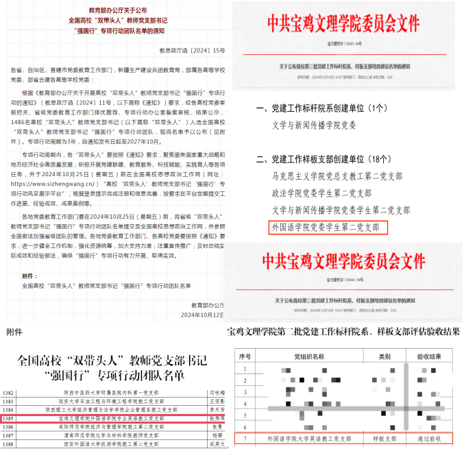 10月12日,教育部办公厅发布《关于公布全国高校“双带头人”教师党支部书记 “强国行”专项行动团队名单的通知》,经各高公司党委审核把关、省级党委教育工作部门择优推荐、专项行动办公室备案审核、结果公示,1486名高校“双带头人”教师党支部书记(以下简称“双带头人”)入选全国高校“双带头人”教师党支部书记“强国行”专项行动团队。best365中国官方网站专业英语教工党支部成功入选。高校“双带头人”教师党支部书记“强国行”专项行动是创新立德树人根本任务,深入贯彻落实教育部党组关于高校“双带头人”教师党支部书记培育工作的部署要求,充分发挥高校“双带头人”示范引领作用,引导广大师生在以中国式现代化全面推进强国建设、民族复兴伟业新征程上砥砺新担当、展现新作为的具体措施和生动实践。