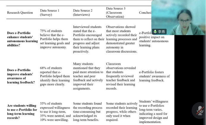 刘敏副经理在总结发言中强调了论文写作中保持严谨、科学态度的重要性,并指出研究数据之间必须建立逻辑联系。她以李燕博士展示的三角互证为例,说明了研究问题与研究结果之间逻辑联系的重要性,鼓励和要求同学们在论文写作过程中注重数据的科学性和逻辑性。