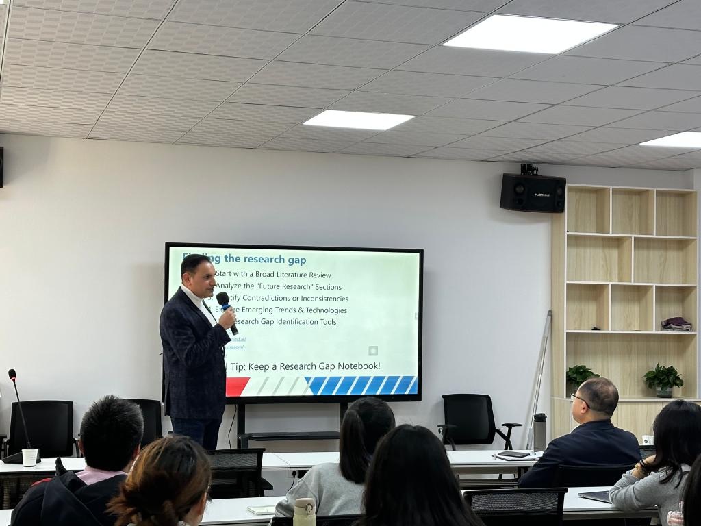 Dr. Muhammad Awais Baloch围绕SSCI/SCI期刊论文选题、资料搜索文献阅读与写作、数据收集与实验、数据统计与分析、语言文字与撰写、投稿格式与要求、期刊选择与投稿、审稿意见的修改与回复等层层展开。他从国际学术期刊重要性、新颖性、前瞻性三个方面展开讲解,鼓励大家要勇于撰写学术论文并积极尝试国际期刊投稿。随后分别从研究热点方向、研究领域以及写作及投稿建议等方面结合自身投稿经验,为老师和研究生们的外文论文写作提出建议。最后,Dr. Muhammad Awais Baloch结合自身投稿经验讲解了写作及投稿细节以及投稿后的沟通注意事项,并耐心解答了现场师生的提问。