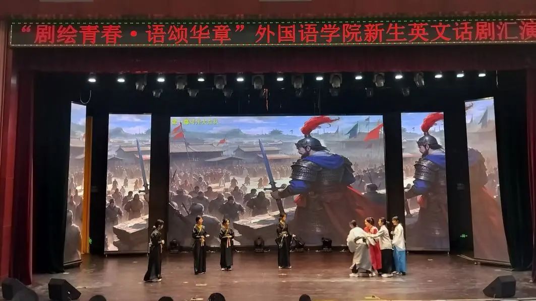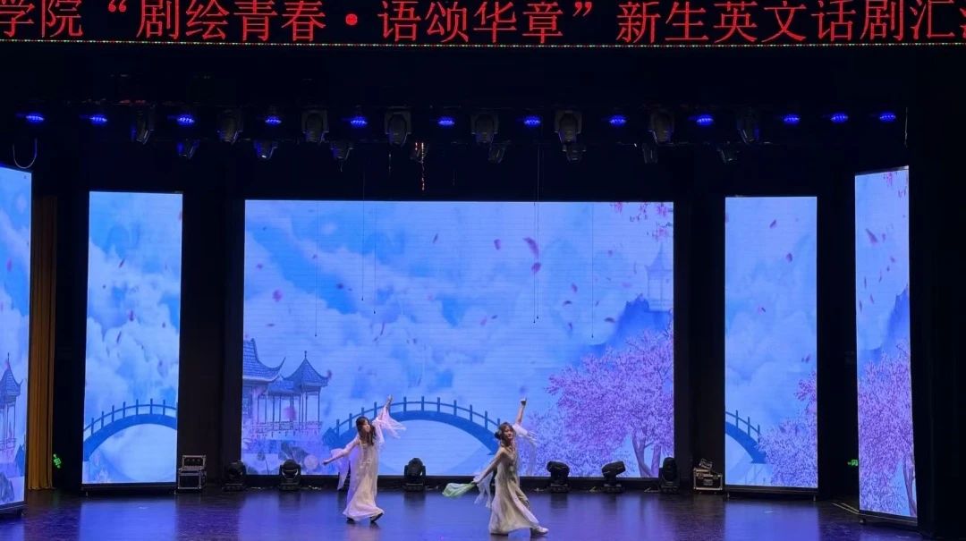 汇演以舞蹈《又见青白》开场, 7 个新生班同学用英语演绎了《木兰从军》《半条棉被》《完璧归赵》《梦想的接力》《荆轲刺秦王》《保卫延安》《五四运动》等纵贯古今的 7 个故事,题材丰富、主题鲜明,将中国传统文化与专业特色深度融合,展现了中华民族精神力量及当代青年传承文化基因的决心。现场表演生动,剧情设计巧妙,赢得阵阵掌声。