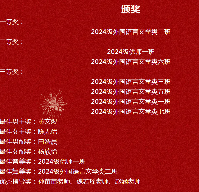 评委黄龙飞、外籍教师Miller Edward Francis对话剧作品及同学们的演绎进行点评,赞扬同学们的表演,肯定其努力,并希望新生们继续加强英语语法知识和语音语调学习。汇演最终评出剧目一、二、三等奖,最佳主、配角,最佳舞美、音美等奖项。