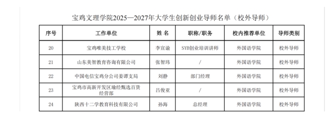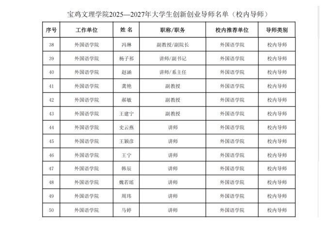 根据《关于公布公司老员工创新创业导师库入选名单的通知》(宝文理院教字〔2025〕36号),公司审批聘请292名老员工创新创业导师,聘期两年(自2025年4月至2027年4月止)。best365中国官方网站获聘18名,其中校内导师13名,校外导师5名。具体名单如下: