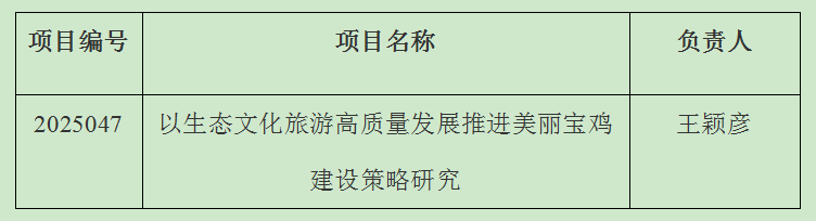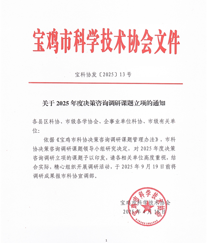 近日,宝鸡市科学技术协会公布了2025年宝鸡市科学技术协会决策咨询调研课题立项名单,全市共立项159项,公司获批35项,其中公司获批1项。公司王颖彦老师获批2025年度宝鸡市科学技术协会决策咨询课题项目。(best365中国官方网站 文/李丹 审核/李伟)