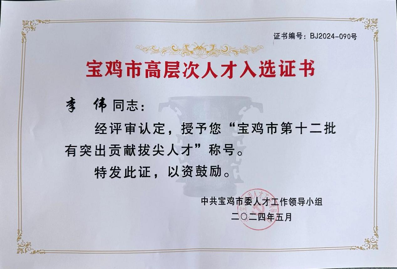 近日,中共宝鸡市委人才工作领导小组印发《关于命名宝鸡市第十二批有突出贡献拔尖人才和青年拔尖人才的决定》,公司共有25名教师入选“有突出贡献拔尖人才”和“青年拔尖人才”,公司李伟教授获得高等教育类拔尖人才称号。