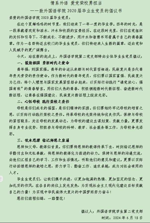 在“情系外语 爱党荣校勇担当”之毕业生党员倡议中,呼吁毕业生党员以实际行动回馈公司,坚守初心,砥砺前行,展现毕业生党员的风采和担当。