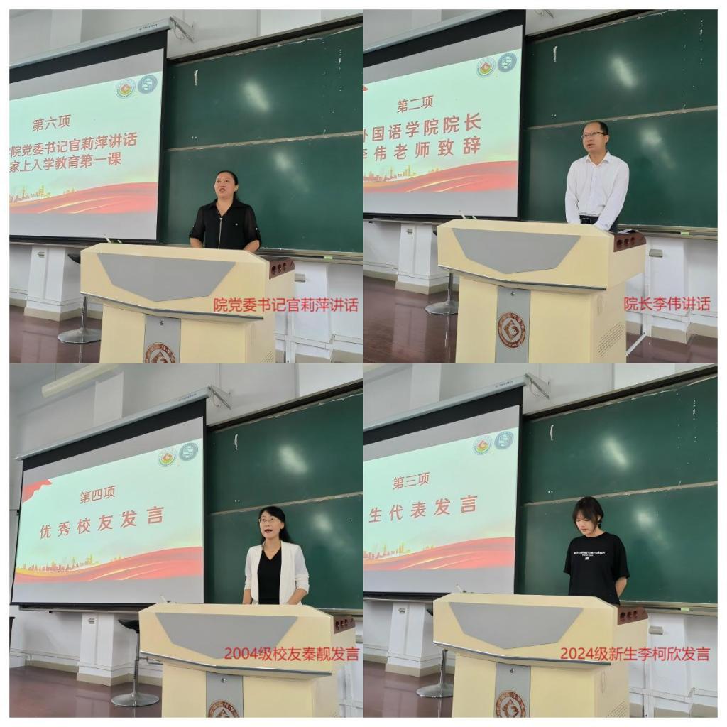 2024级外国语言文学类2班的新生代表李珂欣同学发表感言,她表达了对未来的憧憬,并期望与同学们共同创造一段难忘的大学经历。外语系2004级员工,宝鸡高新第一中学教师秦靓向新生们传达了期望,鼓励他们拓宽视野、磨练品格,并希望每位外语专业的员工都能发现并实现自我价值,理解人生的意义。此外,党政办公室的教学管理人员及辅导员老师也分别进行了自我介绍,并表达了对与同学们未来四年愉快相处的期待。