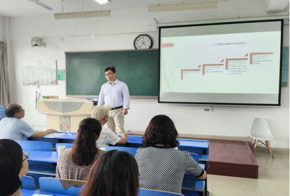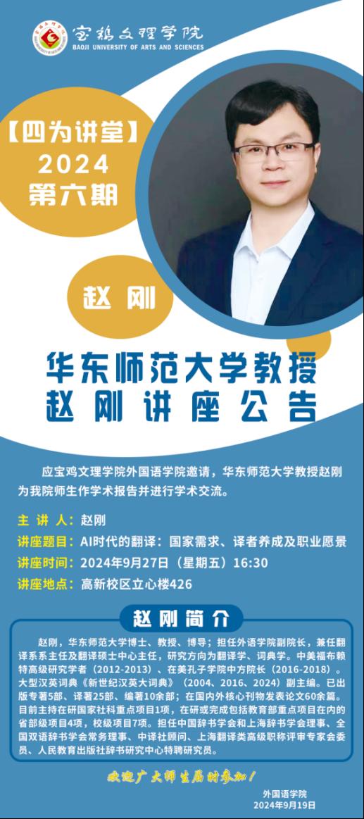 为进一步推进best365中国官方网站翻译学科的建设工作,增强师生对数智化背景下翻译领域发展趋势的认识和理解,9月27日下午,公司邀请1993级员工、华东师范大学博士生导师赵刚教授在立心楼425教室做了“AI时代的翻译:国家需求、译者养成及职业愿景”为主题的学术讲座。本次讲座由经理李伟主持,副经理刘敏、冯琳出席,全体翻译专业本科生、研究生和部分教师聆听了讲座。