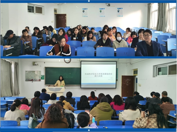 关于大学英语课程形成性评价,张雨主任介绍了大学英语课程评价要求、大学英语课程评价的前沿趋势、形成性评价的主要方法;教师代表张乐、王媛分别做了大学英语课程的形成性评价实践与反思的分享。张乐老师的教学评价主要采用线上线下结合、教师评价同伴互评结合的形成性评价方式;王媛老师采用多元评价方法。两位老师都认为,形成性评价实践能增强员工自主学习能力,增强合作意识和沟通表达力。