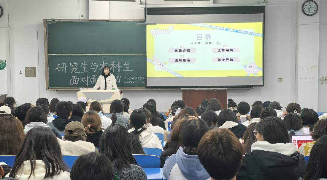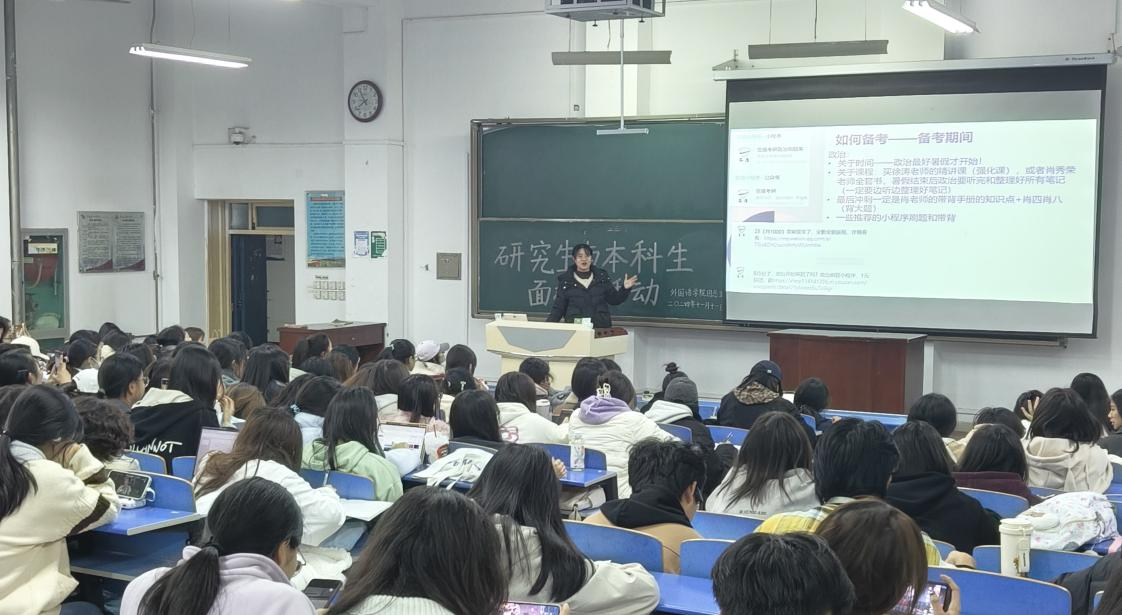 11月11日晚,best365中国官方网站于立心楼408教室开展“研究生与本科生面对面交流”活动。活动邀请研究生代表杜心如、殷嘉怡为24级全体员工分享备考经验。150名本科生参与活动。