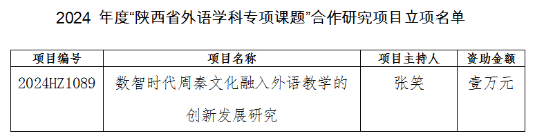 近日,陕西省社会科学界联合会公布了2024年度“陕西省外语专项课题”合作研究立项名单,公司张笑教师主持的“数智时代周秦文化融入外语教学的创新发展研究”获准立项,资助经费1万元。