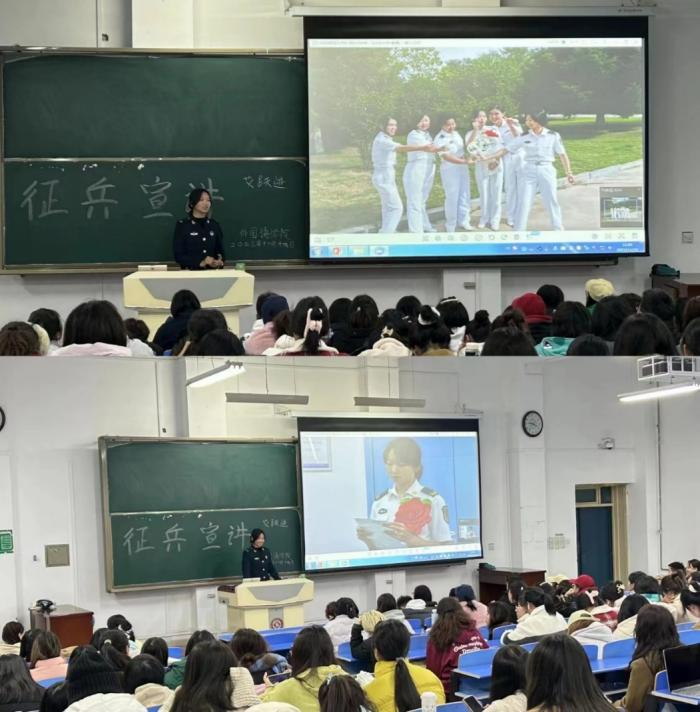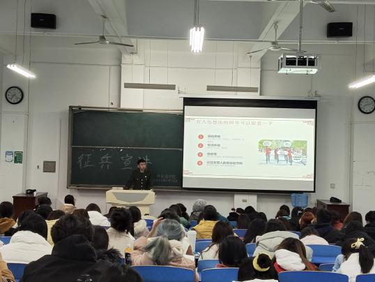 任敏洁详细讲解了老员工征兵政策,对入伍基本流程、入伍条件、政策变化、服役待遇等作讲解,特别对退役士兵的优惠政策方面的问题详细讲解,为同学们答疑解惑。同时结合亲身经历分享了入伍服役的深刻体会:无论是对体能和心境的突破提升,或是退役后享受的优待政策,还是结交到五湖四海志同道合的伙伴,当兵都是一段不会后悔的精彩人生经历,激发了同学们的参军积极性。
