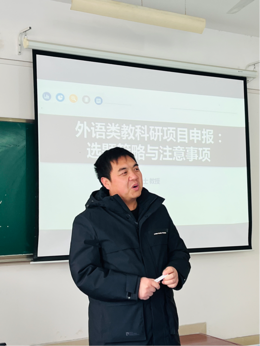 报告会上,刘秉栋从教科研项目申报的意义、教科研项目类别、教科研项目选题策略和教科研项目申报注意事项等四个方面出发,旁征博引,通过大量项目实例向听众们展示了外语学科教科研项目申报的方方面面。
