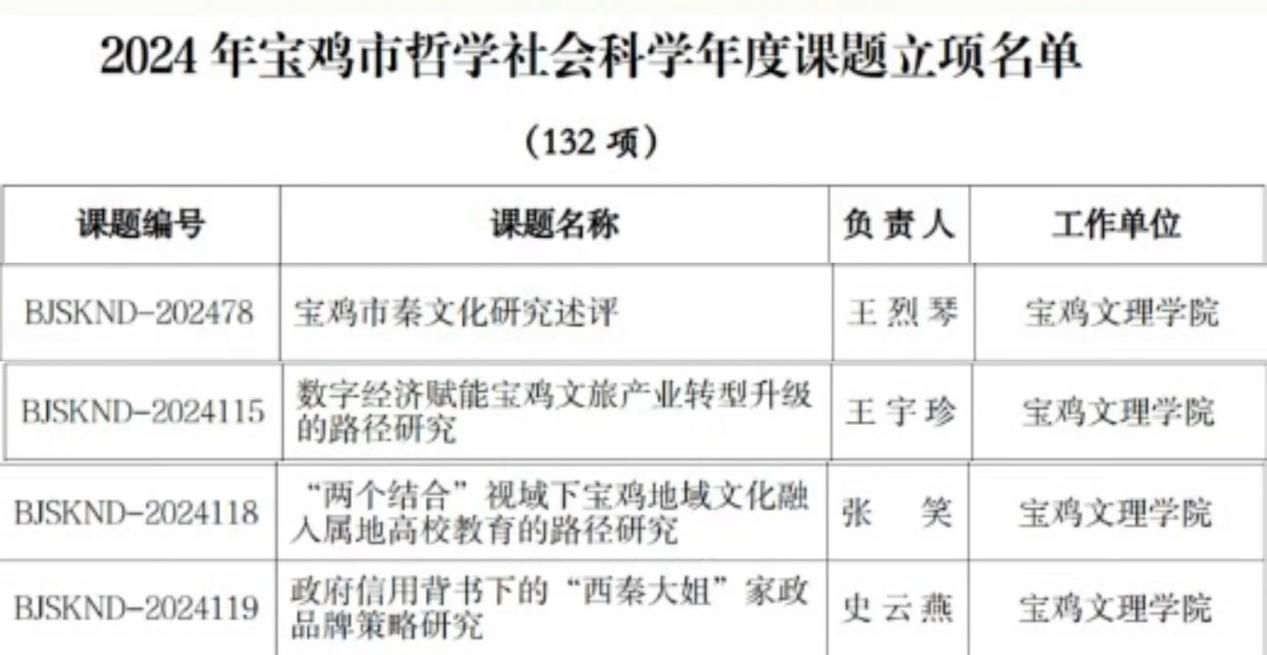 近日,宝鸡市哲学社会科学工作领导小组办公室公布了2024年宝鸡市哲学社会科学年度课题立项名单,全市共获批132项,公司申报123项,立项81项,其中公司教师王烈琴、王宇珍、张笑、史云燕获批2024年度宝鸡市哲学社会科学专项课题。