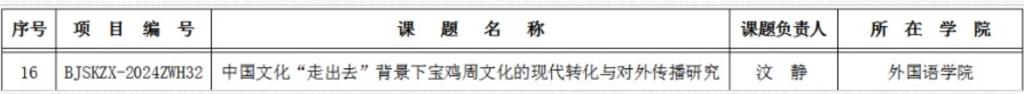 近日,宝鸡市哲学社会科学工作领导小组办公室公布了宝鸡周文化研究专项课题立项名单,全市共获批32项,其中公司获批16项,公司教师汶静获批宝鸡周文化研究专项课题。