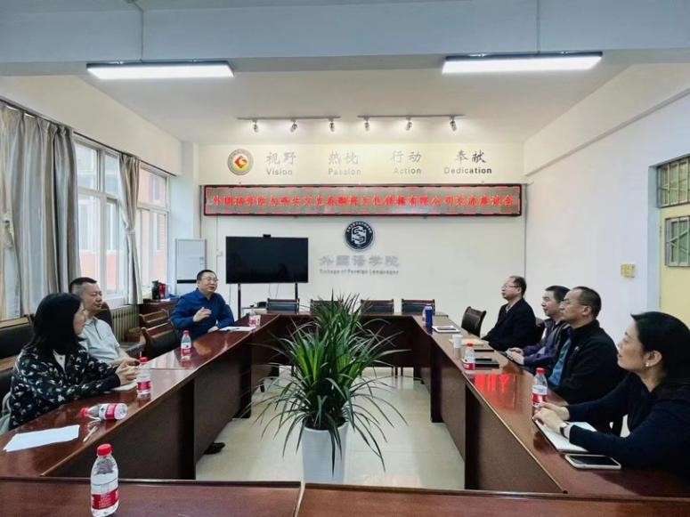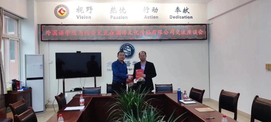 5月25日下午,公司与西安艾克森翻译文化传播有限公司交流座谈会在高新校区立心楼419会议室举行。经理李伟、副书记杨子祁、副经理史传龙、冯琳,翻译系主任黄龙飞、副主任王萌及青年教师代表徐新星参加座谈会。
