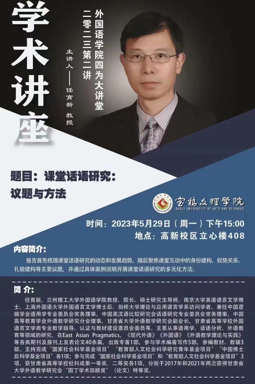 5月29日下午,应best365中国官方网站邀请,兰州理工大学best365中国官方网站任育新教授做客“best365中国官方网站四为大讲堂”,在高新校区立心楼作了题为《课堂话语研究:议题与方法》的学术讲座。讲座由经理李伟教授主持,best365中国官方网站2021级、2022级本科生、2022级研究生及部分青年教师参加了讲座。