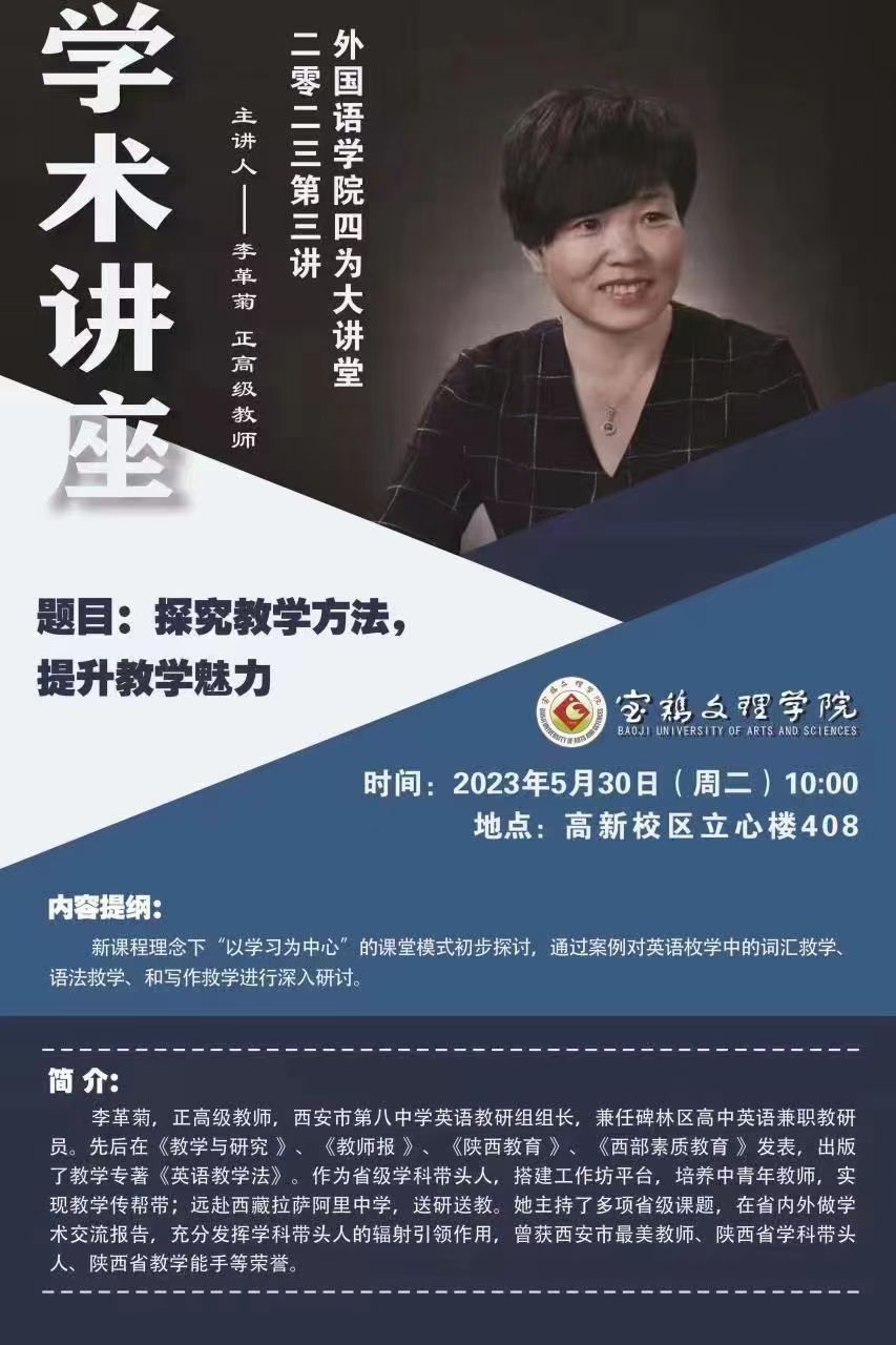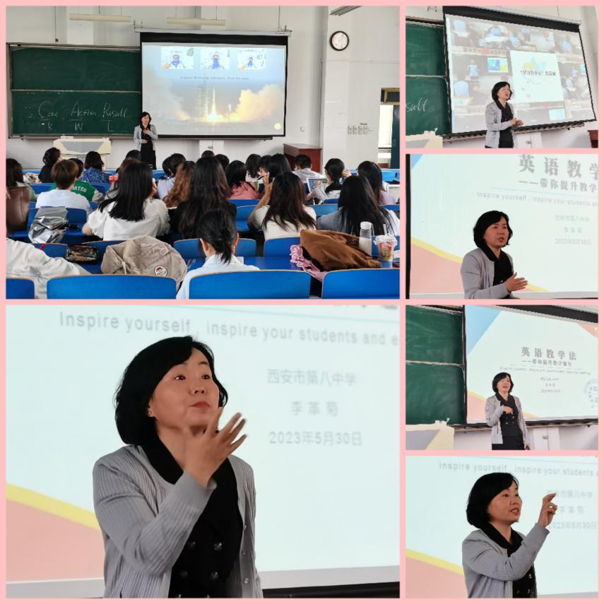 5月30日上午10:00-12:00,西安市第八中学正高级英语教师,陕西省基础教育资源应用名师,省级学科带头人,省级教学能手李革菊老师应邀在高新校区立心楼408教室为best365中国官方网站英语专业本科生、学科教学(英语)硕士研究生及best365中国官方网站青年教师做了题为“探究教学方法,提升教学魅力”的学术讲座。