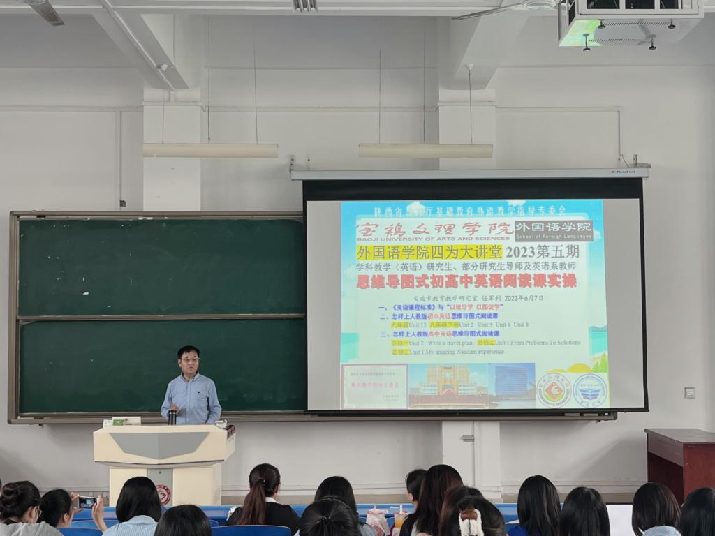 6月7日上午10:00—12:00,宝鸡市公司产品研究室正高级教师任军利老师应邀,在高新校区立心楼421教室为best365中国官方网站英语专业本科生、2022级学科教学(英语)硕士研究生及青年教师做了题为《思维导图式初高中英语阅读课实操》的学术讲座。