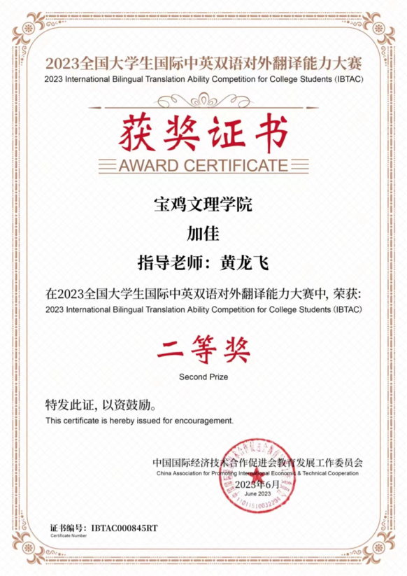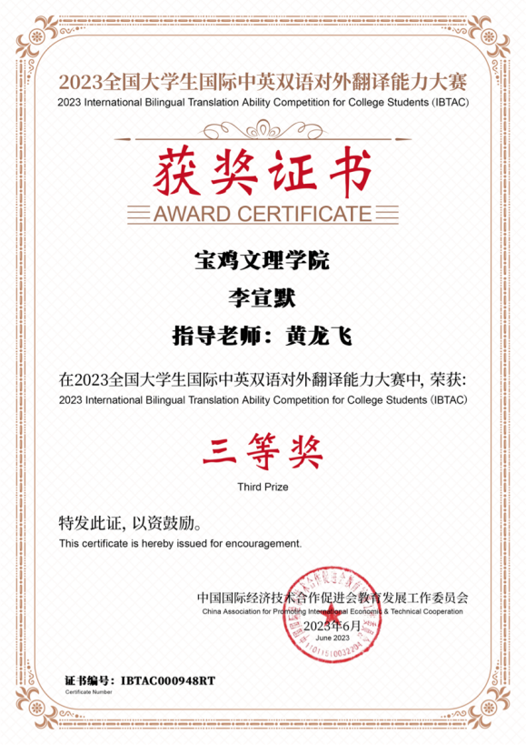 近日,2023年全国老员工国际中英双语对外翻译能力大赛(2023 International Bilingual Translation Ability Competition for College Students,简称IBTAC) 结果揭晓。best365中国官方网站2020级翻译二班员工加佳获二等奖、李宣默获三等奖,翻译系教师黄龙飞担任指导教师。