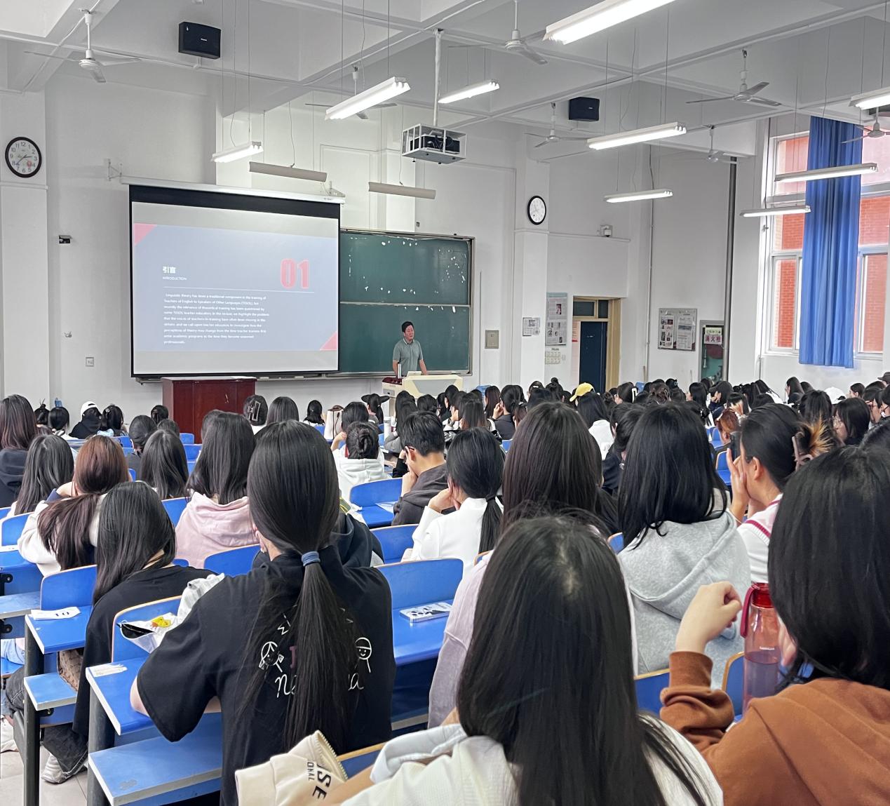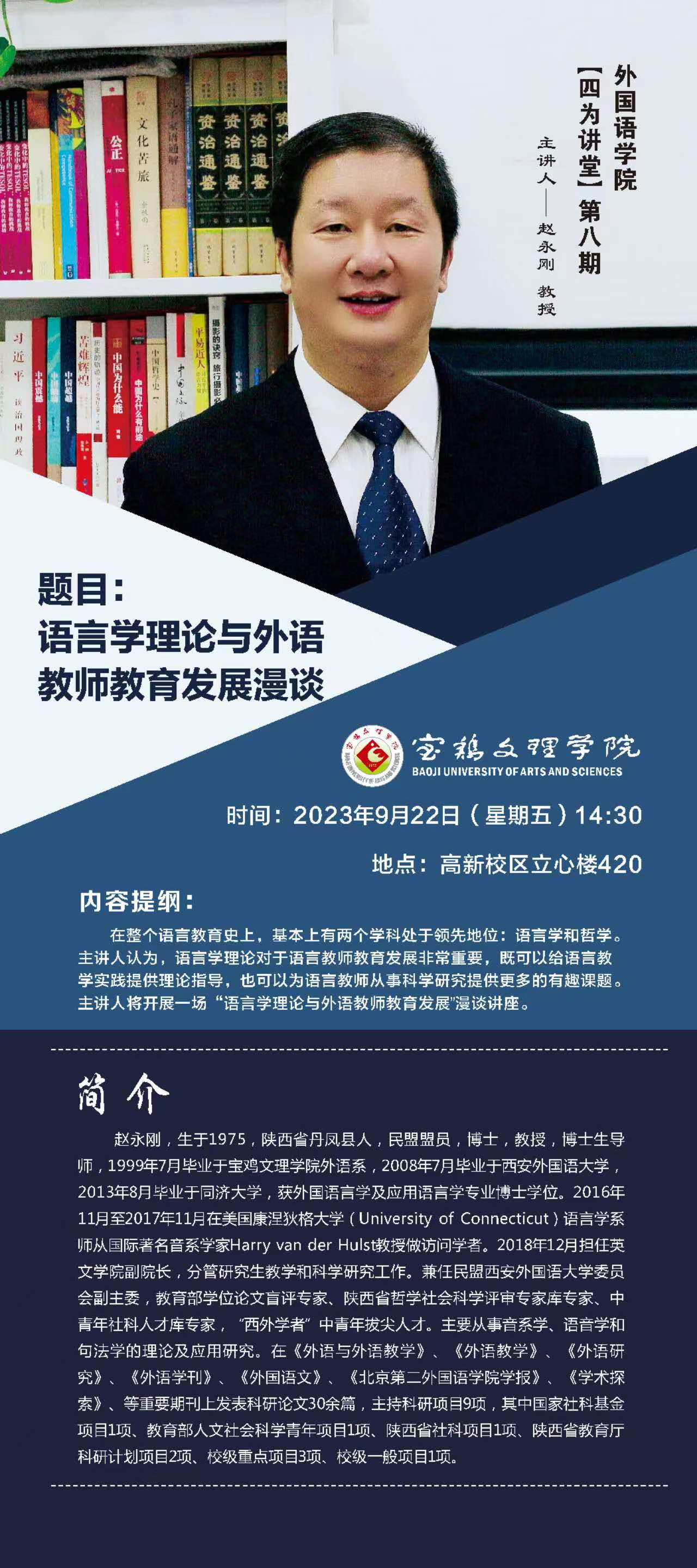 9月22日下午,best365中国官方网站博士生导师赵永刚教授应邀在立心楼420教室作了题为《语言学理论与外语教师教育发展漫谈》的讲座。best365中国官方网站经理李伟主持讲座开讲仪式,副经理史传龙做总结发言,公司部分研究生导师、青年教师及学科教学(英语)专业研究生和英语、翻译专业本科生200余人参加了此次讲座。