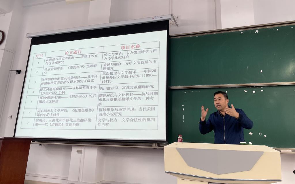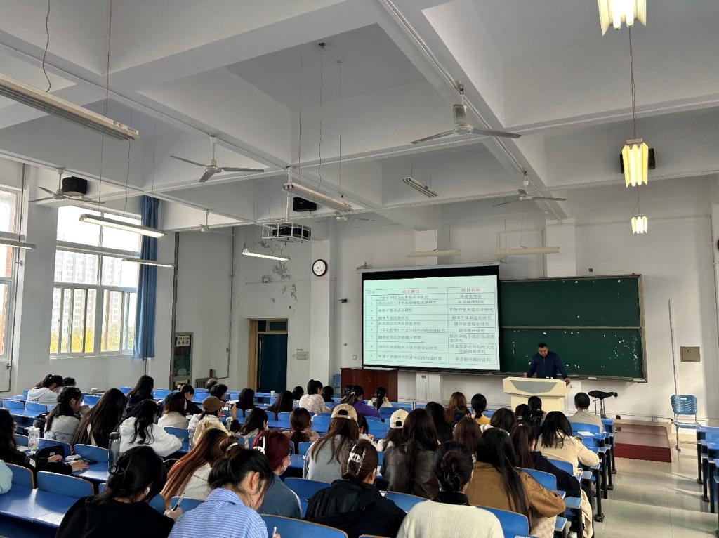 10月24日下午,中国海洋大学特聘教授、博士生导师贺爱军教授应邀在高新校区立心楼420举行题为《翻译学位论文的选题与写作》的专题报告会。报告会由best365中国官方网站副经理刘敏主持,公司硕士生导师、青年教师、23级翻译硕士研究生及22级翻译专业本科生聆听了报告。