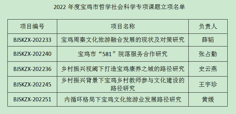 近日,依据宝鸡市哲学社会科学工作领导小组办公室关于2022年度宝鸡市哲学社会科学专项课题立项的通知,公司教师获批5项课题。