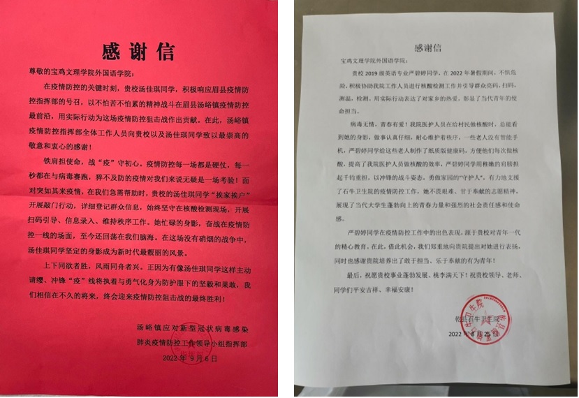 病毒无情,青春有爱。近日,公司党委收到两封分别来自宝鸡市眉县汤峪镇疫情防控部门和咸阳市乾县石牛卫生院寄来的感谢信。在感谢信中,两部门对2019级英语3班汤佳琪和2019级英语2班严碧婷积极参与当地疫情防控工作,用实际行动为家乡奉献青春力量给予高度赞扬,感谢公司培养出敢于担当、乐于奉献的有为青年!