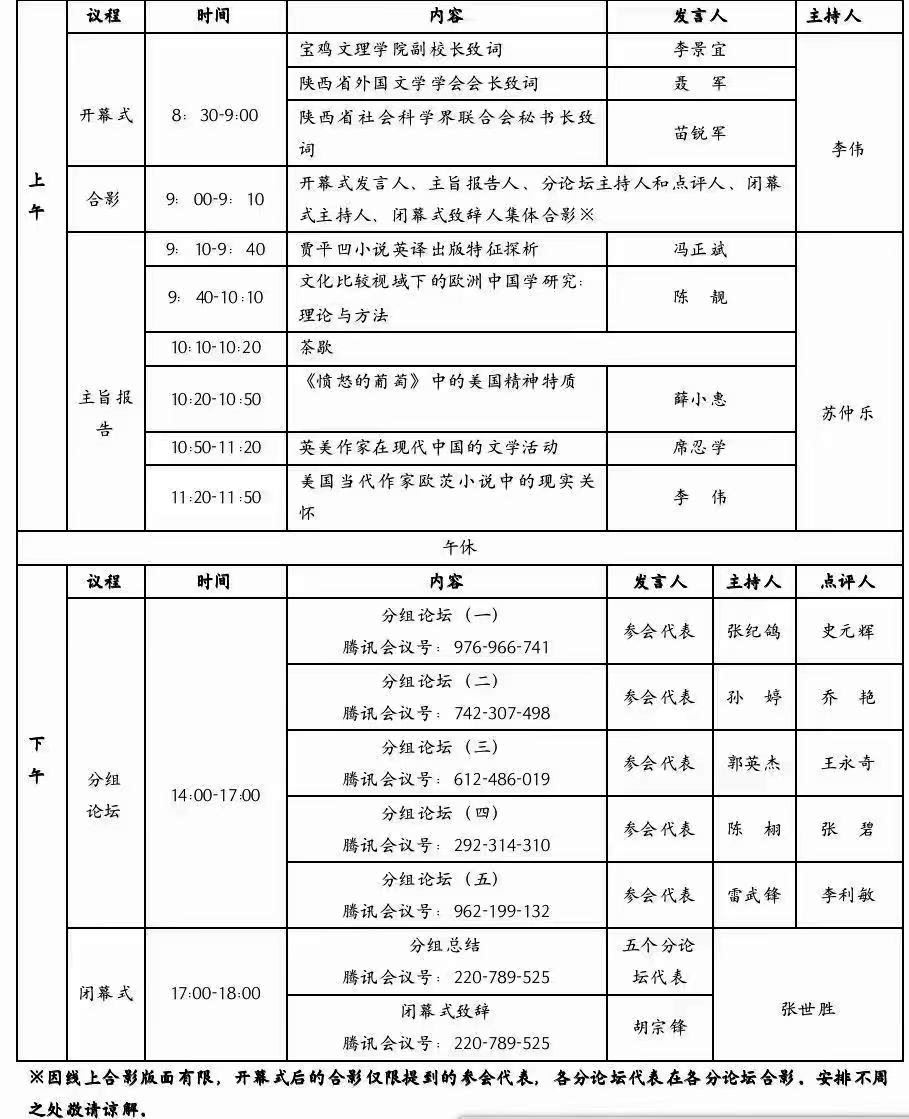 10月15日,由陕西省社科联主办,陕西省外国文学学会和公司best365中国官方网站承办的陕西省外国文学学会年会暨第二十二届学术研讨会在公司举办。会议以“新时代外国文学研究”为主题,以线上形式在腾讯会议平台进行。公司副董事长李景宜教授、陕西省外国文学学会会长聂军教授、陕西省社科联党组成员、二级巡视员、秘书长苗锐军和来自复旦大学、山东大学、北京外国语大学、best365中国官方网站、西北工业大学、陕西师范大学、西北大学、延安大学等21所高校的190多位专家学者和博士、硕士研究生参加了会议。会议开幕式由公司best365中国官方网站经理李伟主持。