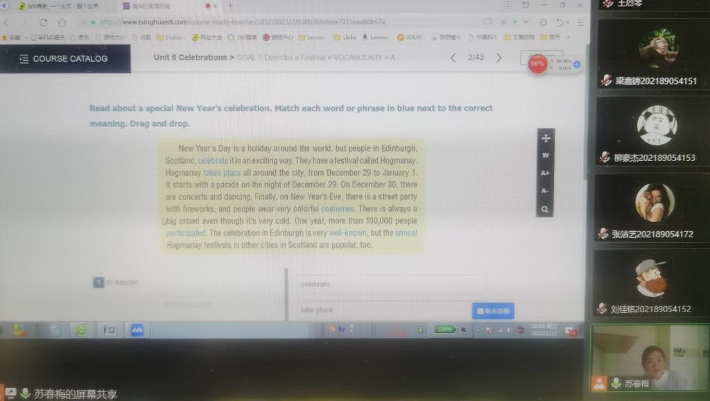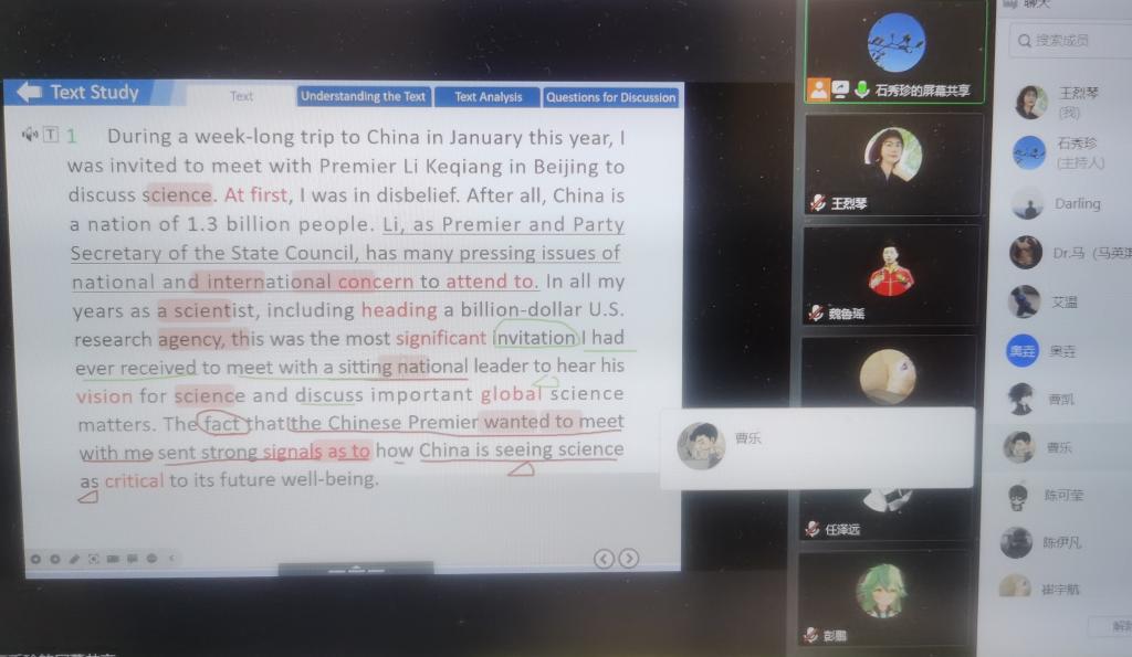 教学督导组成员王烈琴老师、赵莉老师和李欢欢老师集体观摩了best365中国官方网站石秀珍老师和苏春梅老师的线上直播授课,及时与两位授课老师进行了线上的反馈交流,并提出了一些建设性建议。