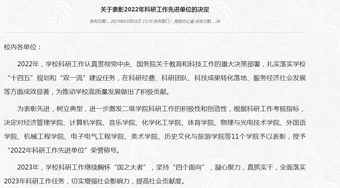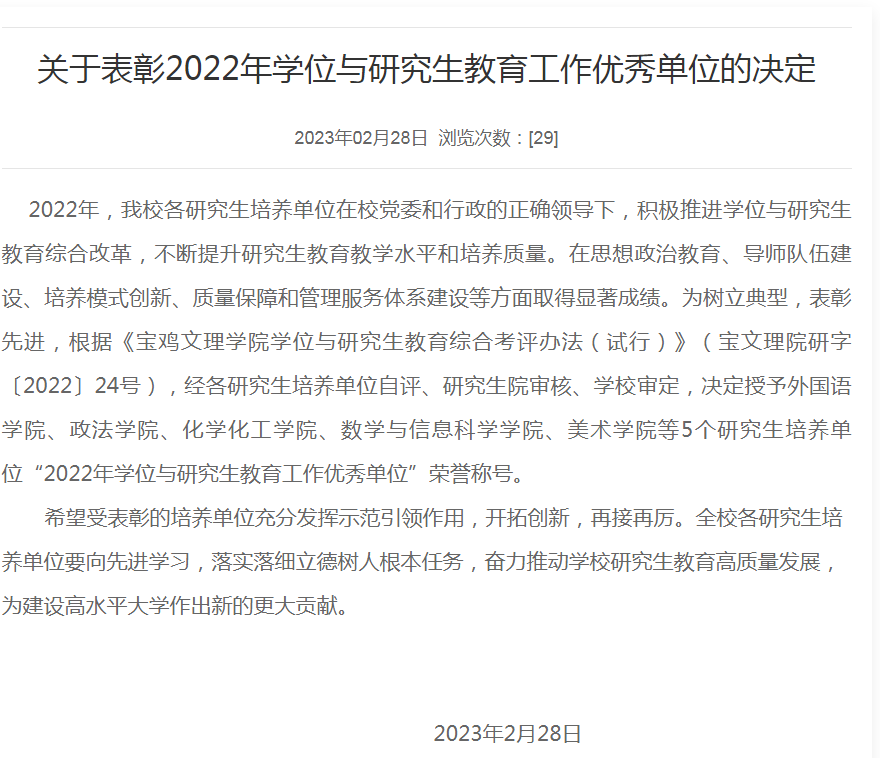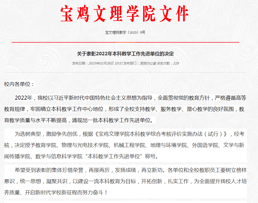 热烈祝贺best365中国官方网站荣获2022年本科教学工作先进单位、2022年学位与研究生教育工作优秀单位和2022年科研工作先进单位。