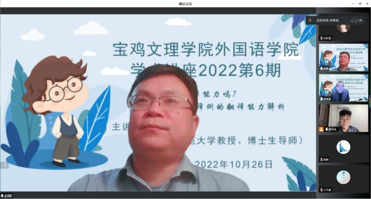 为进一步加强best365中国官方网站翻译团队建设、提升公司师生专业能力,10月26日晚19:30,best365中国官方网站特邀公司1993级员工、华东师范大学博导赵刚教授开展2022年第6期best365中国官方网站学术讲座,讲座题目为《双语能力=翻译能力吗?——基于译例的翻译能力解析》。报告会采用腾讯会议线上进行,由best365中国官方网站副经理史传龙主持。
