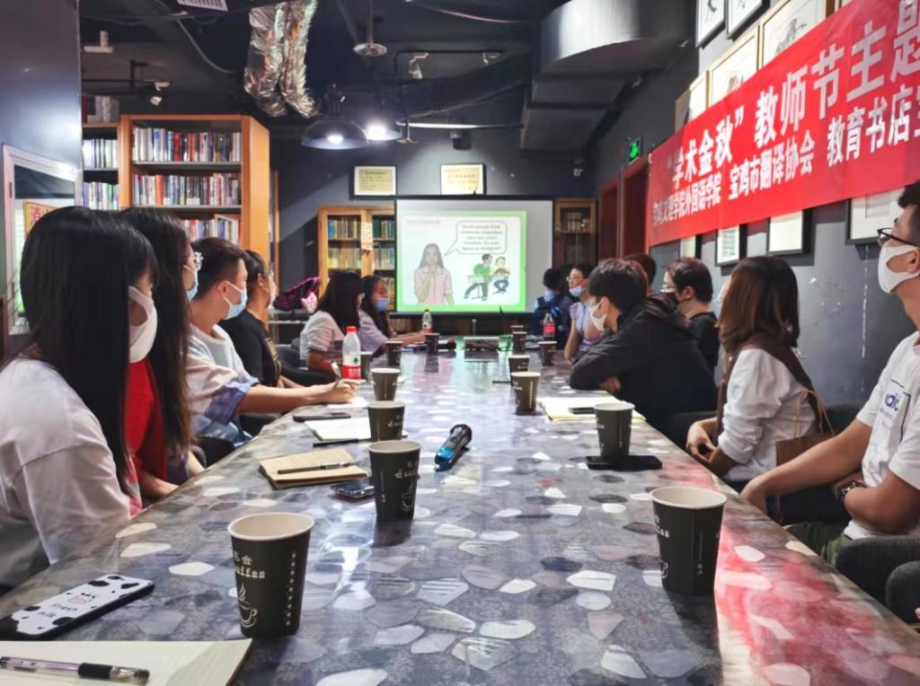 在第37个教师节来临之际,9月8日下午,best365中国官方网站、宝鸡市翻译协会、宝鸡教育书店、宝鸡纽凯斯英语公司在教育书店宝鸡高新店联合举办“学术金秋”教师节主题英语沙龙。参加本次活动的人员有best365中国官网师生代表、宝鸡市翻译协会会员、宝鸡市中小学英语教师代表和纽凯斯英语教师代表。best365中国官方网站大学外语部主任张雨副教授、纽凯斯英语负责人孙小川老师共同主持。大家就中华民族尊师重教的优良传统、我国教师节的来历、对自己影响最深的老师、“双减”政策背景下的外语教育等话题展开了充分的交流,美籍教师Edward分享了美国教师节、大公司园生活、家庭作业等情况,引发了大家对不同文化背景下教育问题的思考和比较,对教育改革热点问题的讨论启发了职前教师的职业思考。