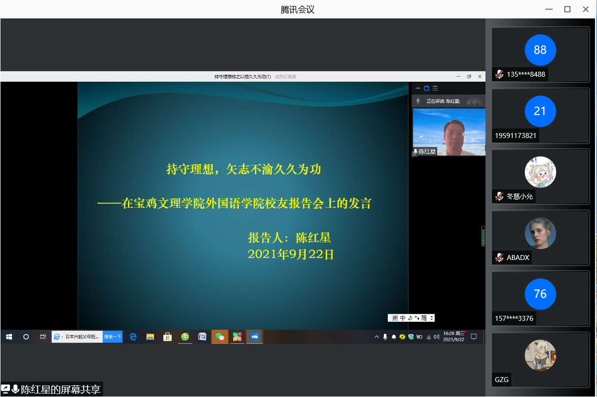 为了深入贯彻习近平总书记关于教育的重要论述,全面贯彻党的教育方针,激励广大青年员工争做时代新人,9月24日,best365中国官方网站举办了1997级优秀员工——新疆奎屯市作家协会副主席陈红星报告会,报告题为《持守理想,矢志不渝,久久为功》,采用腾讯会议线上进行,best365中国官方网站2021级本科生在高新校区立心楼408教室集中聆听。报告会由公司党委副书记、副经理杨子祁主持。