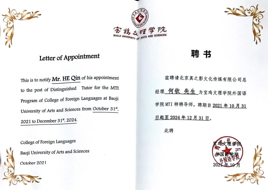 讲座结束后,李伟经理为何钦先生线上颁发了聘书,聘请何钦先生为公司外语公司翻译硕士(MTI)特聘导师。何钦先生表示,在母校翻译人才的培养方面,一定会贡献自己的力量,一如既往地带着自己的作品回母校汇报、交流。他希望以后能够有机会和母校外语公司联合培养电影翻译人才,为中国电影走出去、中国文化的国际传播做出贡献。李伟经理愉快地接受了他的建议。
