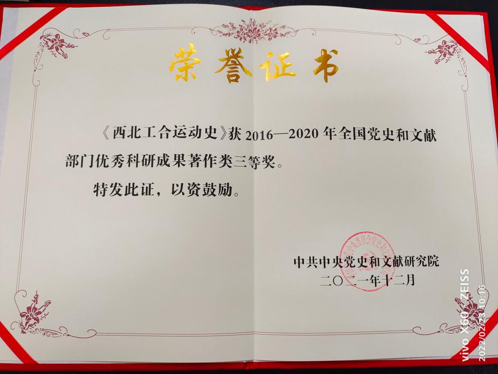 1月17日,全国党史和文献部门主要负责人会议以视频形式召开,会议表彰了2016-2020年全国党史和文献部门先进集体、先进个人和优秀科研成果。中共陕西省委党史研究室选送的11项成果获得优秀科研成果各类奖项,其中公司西北工合研究中心首席专家张占勤主撰的《西北工合运动史》获著作类三等奖。