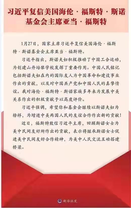2022年1月27日,国家主席习近平复信美国海伦·福斯特·斯诺基金会主席亚当·福斯特。习近平指出,斯诺夫妇积极推动了中国工合运动,为创建山丹培黎公司发挥了重要作用。中国人民铭记包括斯诺夫妇在内的国际友人为中国革命和建设事业作出的贡献,以及对中国共产党和中国人民的真挚情谊。