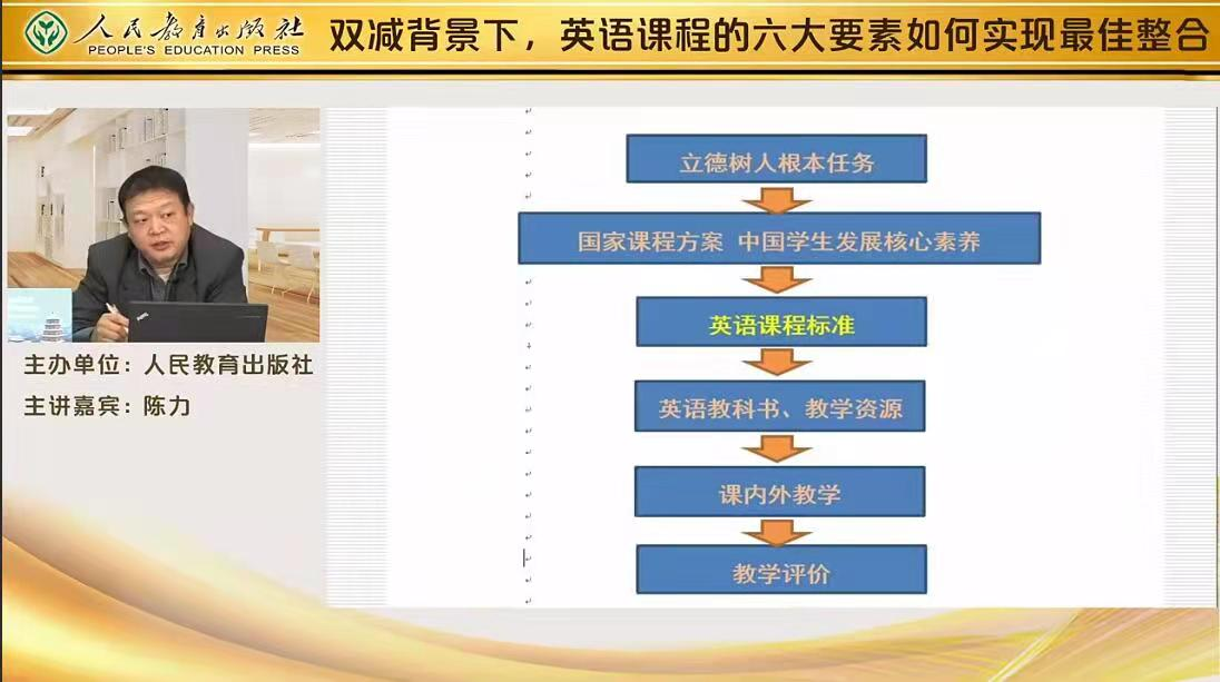 2021年12月30日晚上19:30,best365中国官方网站2020级、2021级学科教学(英语)专业全体研究生在史传龙教授的组织下,开展教育见习活动,通过腾讯会议转播聆听了由人民教育出版社主办的,课程教材研究所研究员、人民教育出版社编审、英语编辑室资深编辑、语言学及应用语言学博士陈力老师主讲的《双减背景下,英语课程的六大要素如何实现最佳整合》讲座。