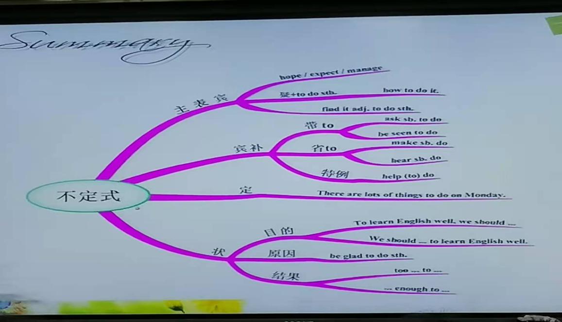 观摩课上,老师给大家展示的一堂语法课—不定式。老师先以思维导图的形式开始,再以歌曲呈现的方式作为铺垫,逐步展示不定式的定义及用法,教学指令清晰连贯,授课清晰明了,层层递进,逻辑严谨,教法精湛,巧妙引导,讲练结合,高效课堂,着实精彩。在座的师生都受益匪浅。