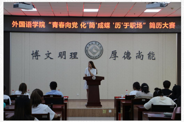 6月9日下午,best365中国官方网站在高新校区甘棠厅举办了“青春向党 化‘简'成蝶‘历'于职场”简历大赛。员工处副处长郝鑫,西安新城高新前景外国语培训中心人力总监张利云、陕西猿起信息科技有限公司人力专员石环、陕西君翰教育科技集团有限公司招聘专员高斐,长颈鹿美语教学董事长韩晓梅应邀担任大赛评委。公司党委书记官莉萍、党委副书记苗亚静以及2018级员工观看了比赛。