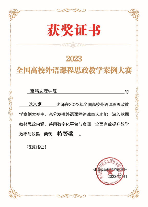 近日,2023年全国高校外语课程思政教学案例大赛落下帷幕。公司best365中国官方网站教师张文雅获特等奖,是公司在课程思政建设方面的又一突破。