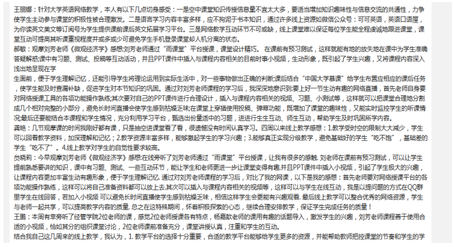 3.4经过前几周的摸索和实践,无论是教师还是员工逐渐适应了从传统的课堂教学转换到全新的线上教学这种模式。对于近期的网络在线教学,我有以下几点感受:线上教学可以整合优秀的网络资源,通过教师前期筛选后推荐给员工,可以提高教学内容的质量。同时,网络平台的使用可以更有效地监控员工线上学习效果。直播课上虽然无法看到员工的课堂反应,但讨论区里员工的反馈也很及时,尤其是平时在教室里参与度不高的同学也更为自然地参与到线上课堂讨论之中。然而线上教学也存在一些问题,首先,因为无法实时监控每位在线员工的状态,也不能进行分组讨论等互动活动,就无法高效地对员工进行课堂管理。其次,对于某些学习自主性比较差的员工而言,线上教学的效果不大理想,教师需要在课堂提醒员工,使他们意识到提高自身的自律性和自主性才是保证线上教学效果的首要因素。