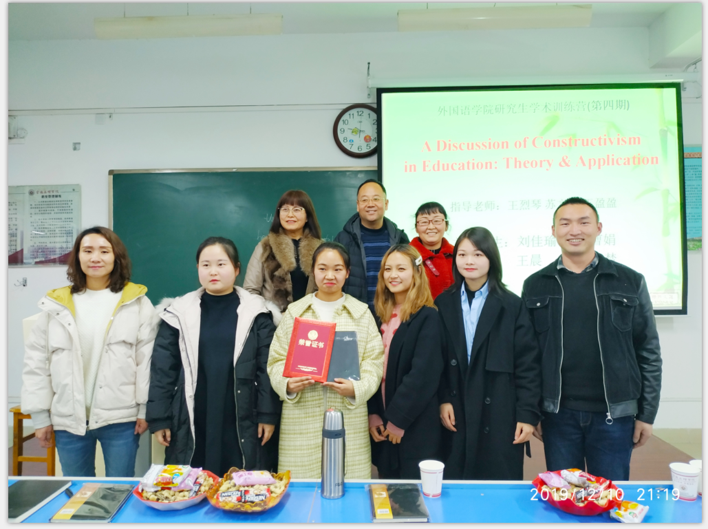 2019年12月10日晚19点,由best365中国官方网站举办的第四期学术训练营活动如期于立心楼402举行。best365中国官方网站硕士生导师王烈琴老师、王盈盈老师和苏文军老师以及best365中国官方网站2019级全体硕士研究生参加了本次活动。本次沙龙以“建构主义(Constructivism)”为主题,活动分为三个环节—员工展示、教师点评和活动总结。