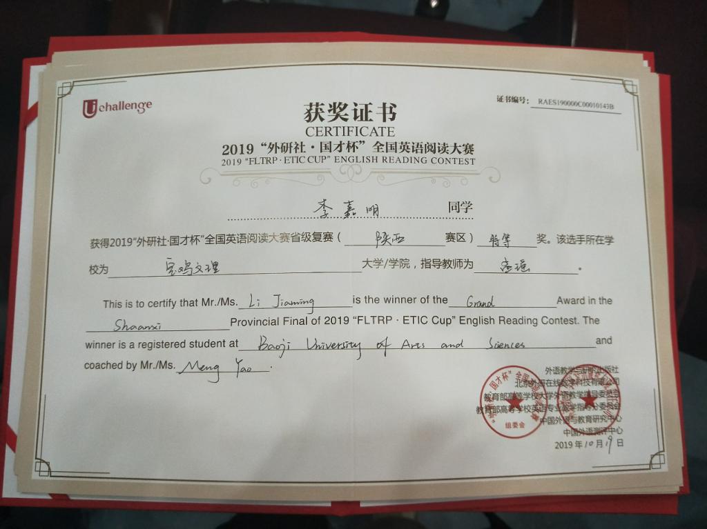 2019年10月19日,“外研社·国才杯”全国英语演讲、阅读写作、大赛陕西省复赛在陕西科技大学。此次比赛共有来自陕西省48所高校的选手进行角逐,公司best365中国官方网站院郑子雯等7位同学参赛,2017级李嘉明同学获得阅读大赛特等奖,顺利晋级全国比赛;2018级张佳怡同学荣获演讲比赛二等奖。