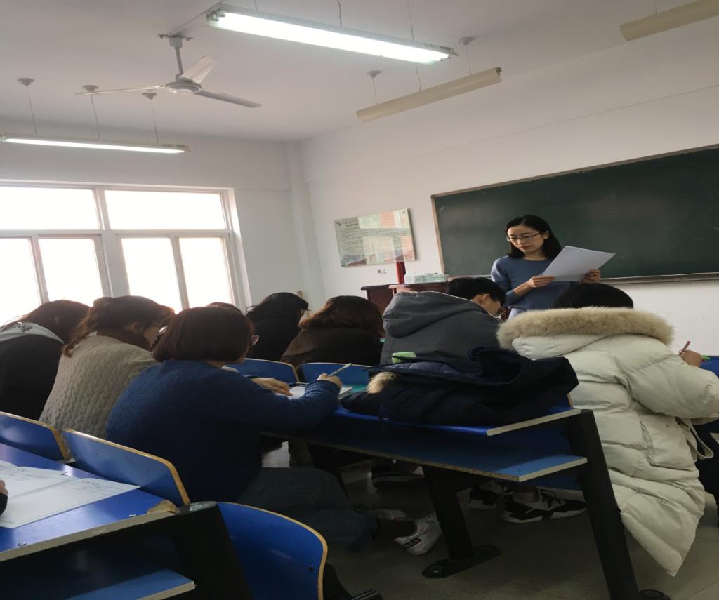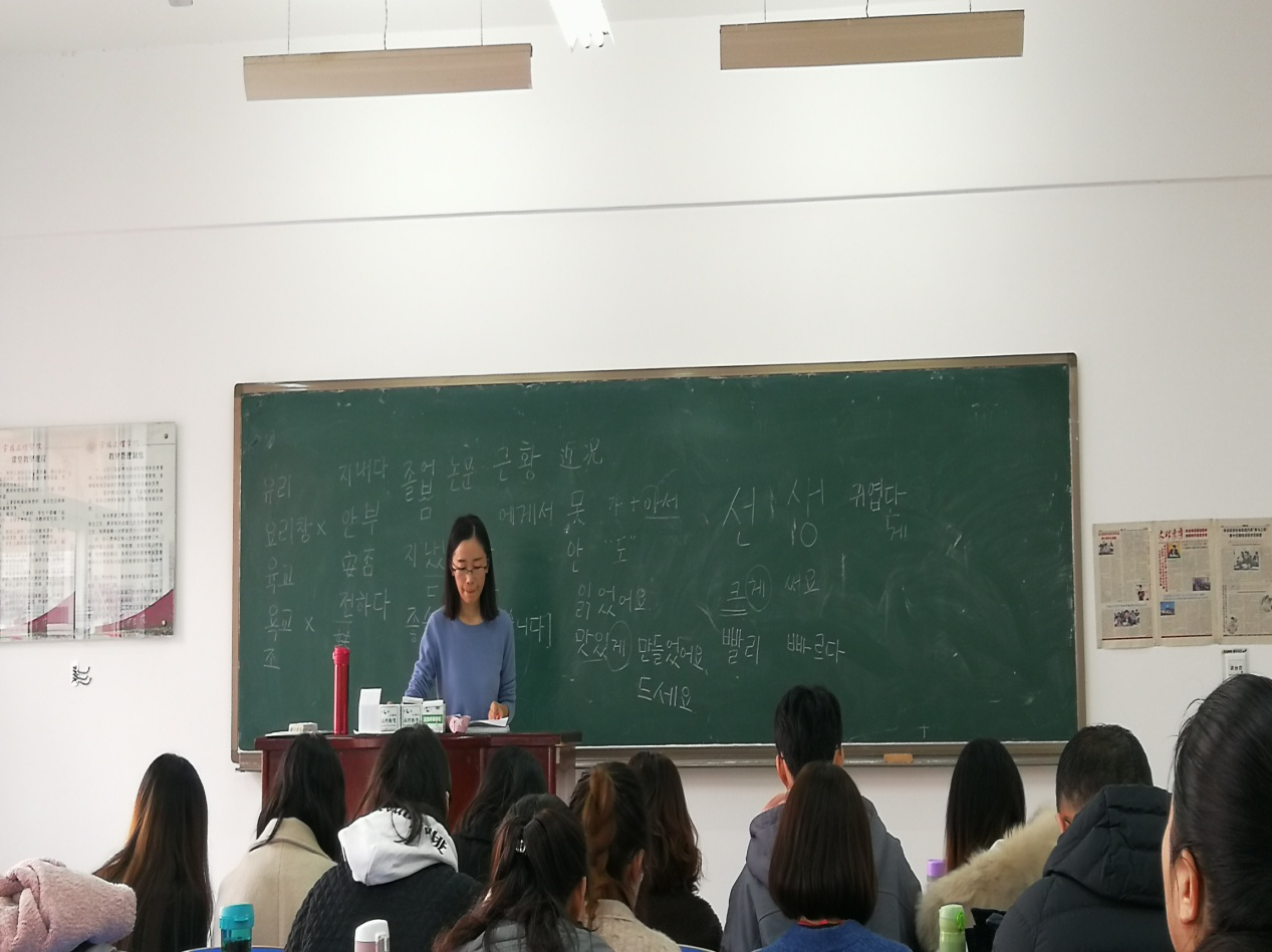 2018年12月5日,外语公司英语系教师集体听课。授课教师为公司新进博士郭玲老师,讲授的课程是《韩国语》。课后,听课教师积极研讨,一致认为郭玲老师讲课认真仔细,书写规范,授课效果良好。